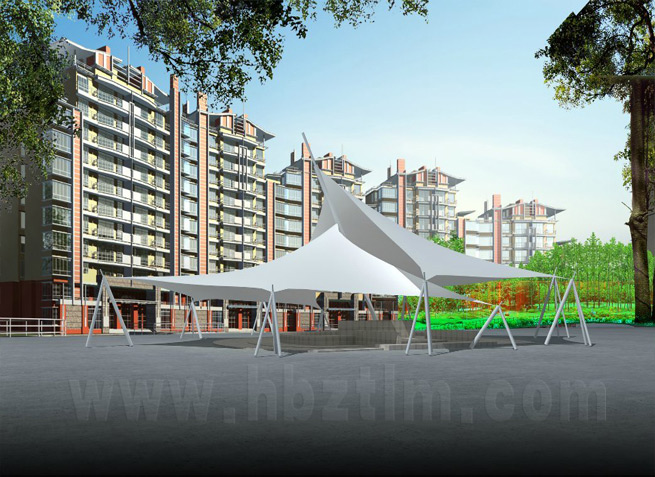 膜材采用PVDF国产或者进口建筑膜材、PTFE玻璃纤维建筑膜材、ETFE透明的永久性建筑膜材;自动放样裁剪,高频焊接,拉伸效果超强,曲线成型可千变万化;膜材质保一般可达15-20年。